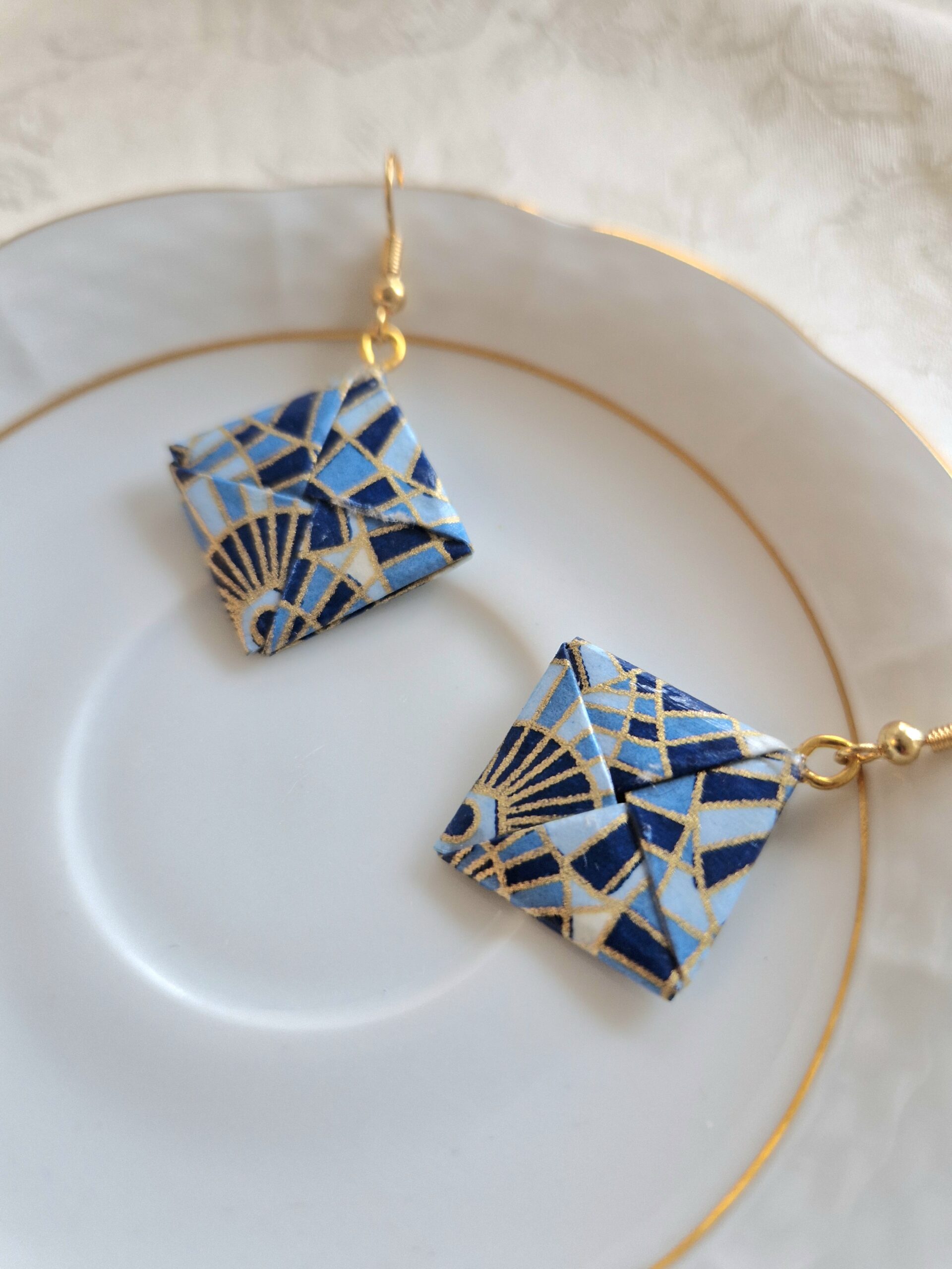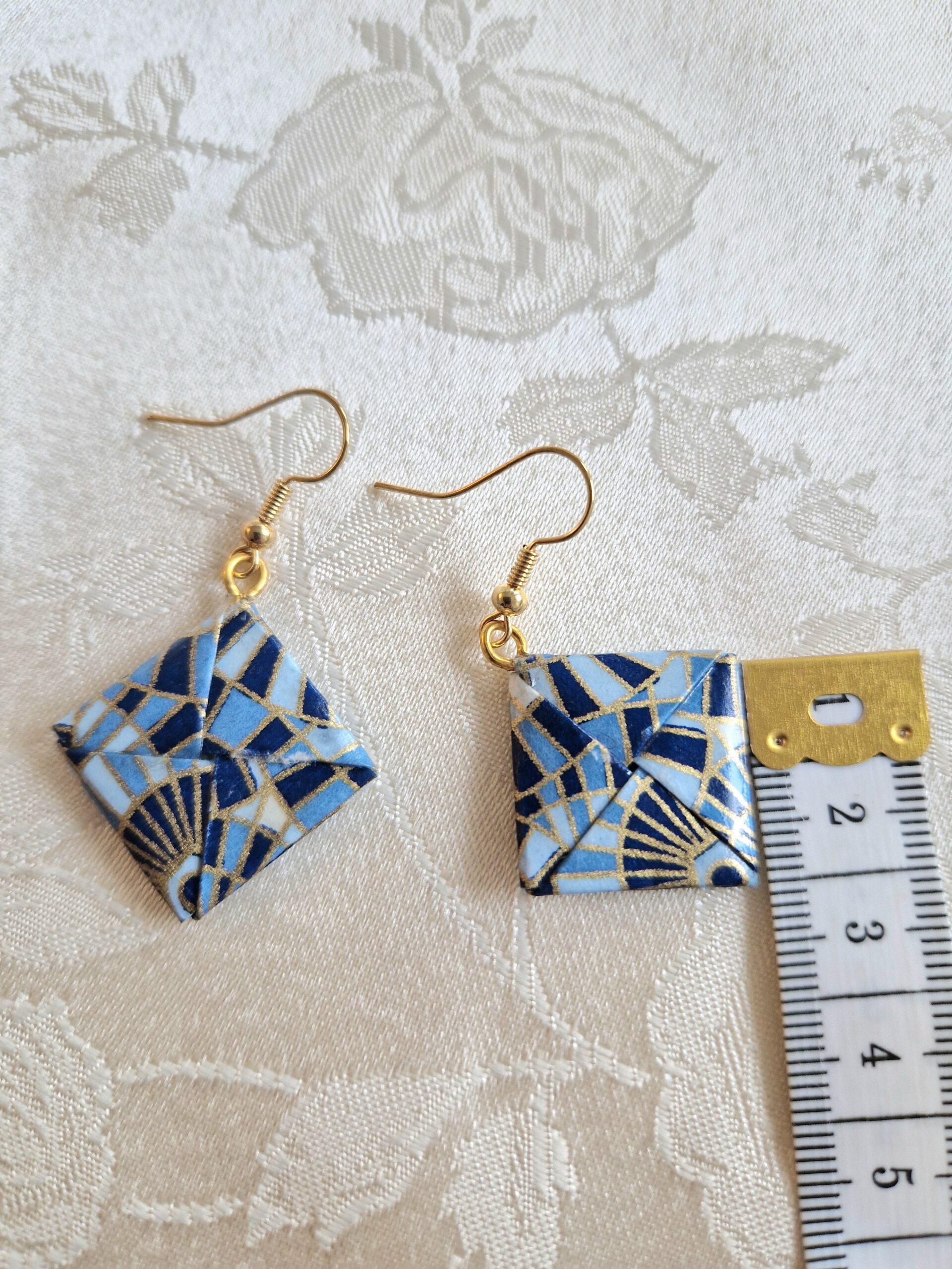 Entretien : Chaque pliage provient d’un carré de papier et pour assurer leur longévité, plusieurs couches de vernis les protègent de l’humidité et du temps. Notez cependant qu’il est recommandé de les retirer avant de prendre une douche. En raison de sa délicatesse, ces bijoux sont à conserver avec soin dans leur pochon / boîte et de les retirer avant de dormir.