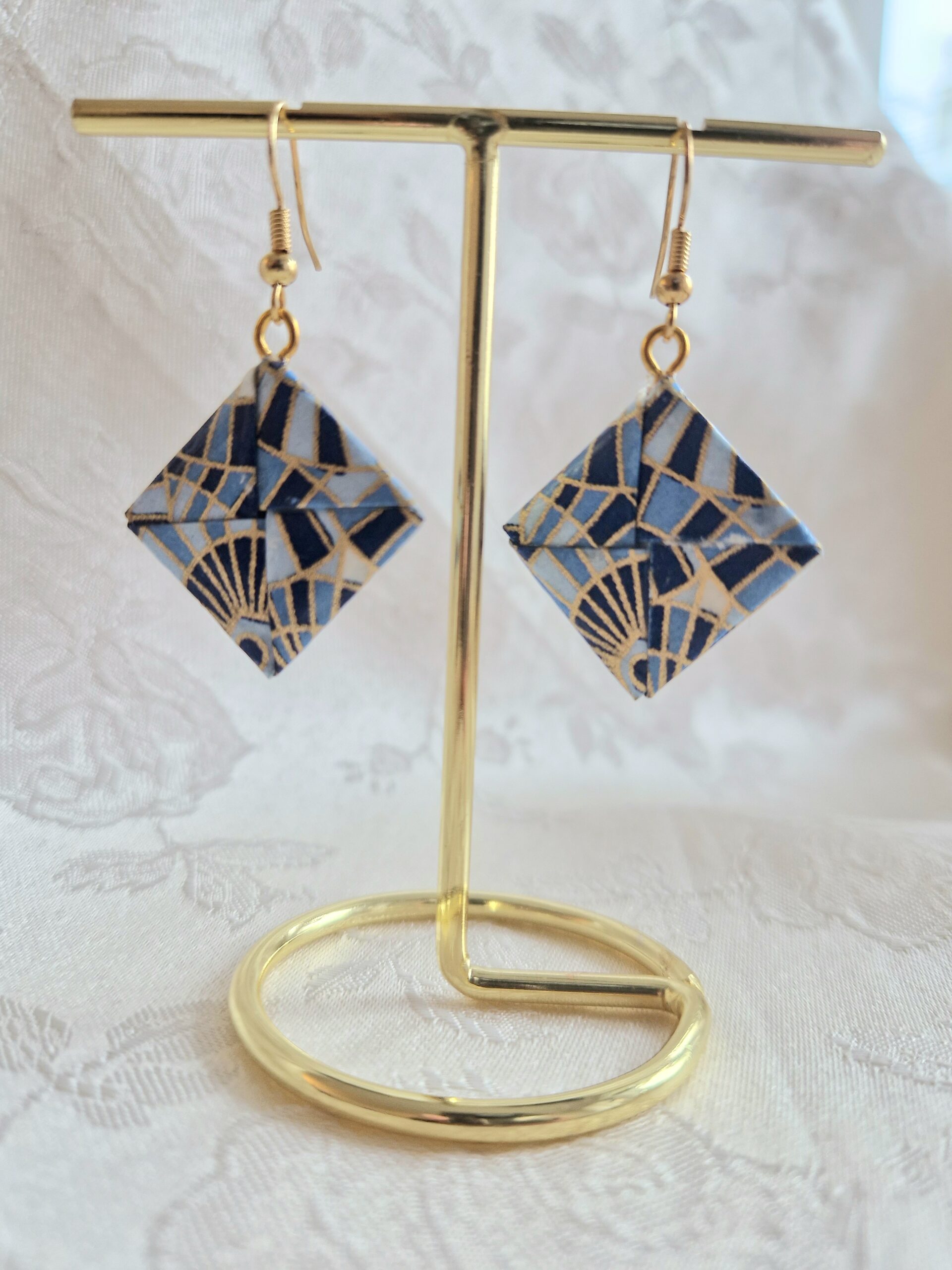 Matériaux : Les crochets sont en laiton et le papier est vernis . La couleur de l’origami varie entre le bleu et le doré.