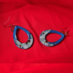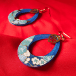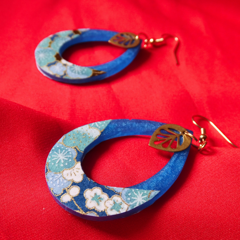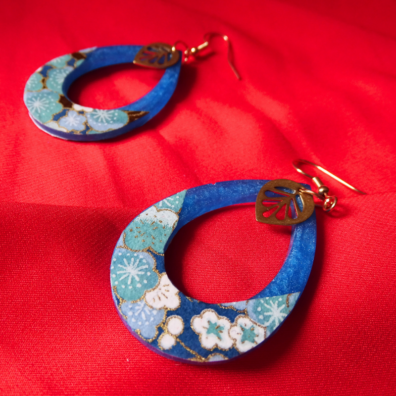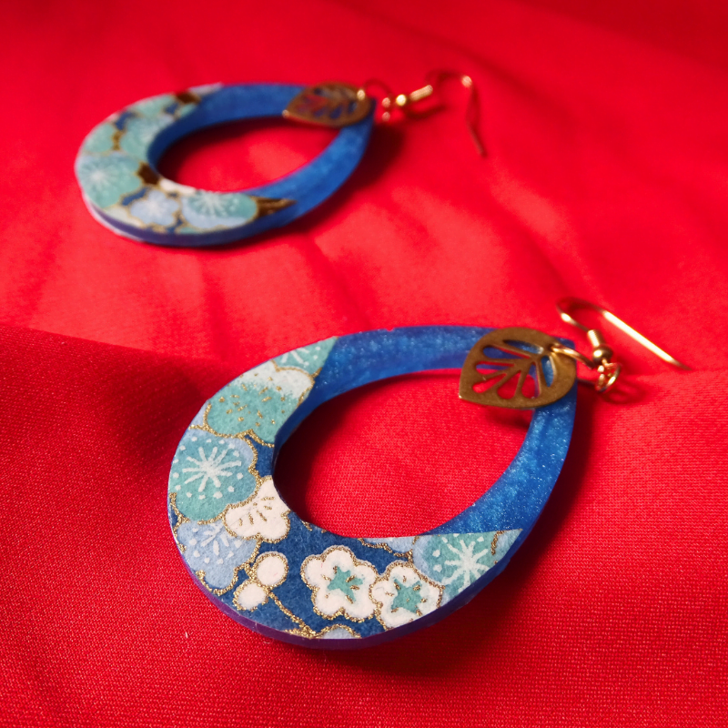 La boucle est de la résine colorée pour un effet bleu nacré. La boucle est très légère et agréable à porter la journée. Le papier washi a été découpé minutieusement pour prendre la forme de la boucle puis protégé avec plusieurs couches de vernis. Le dos de la boucle est recouverte de résine sur le papier pour un effet bombé.
