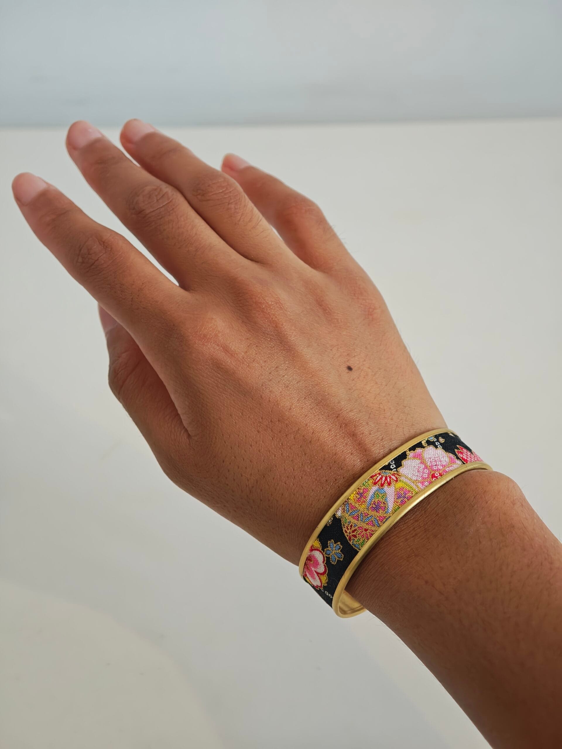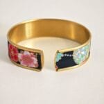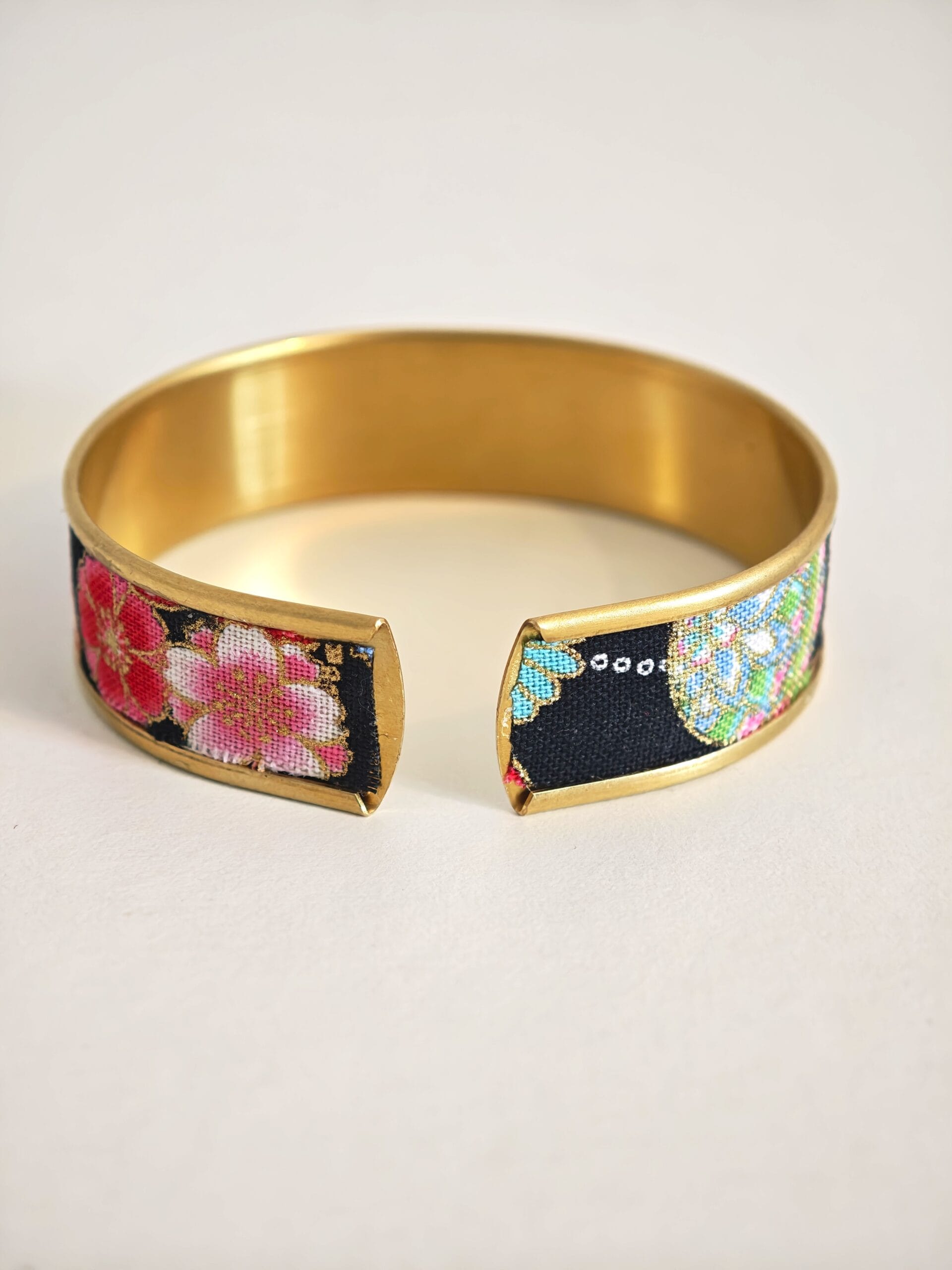 Bracelet manchette réglable en laiton doré avec rebord, recouvert de tissus au motif fleuris japonais !