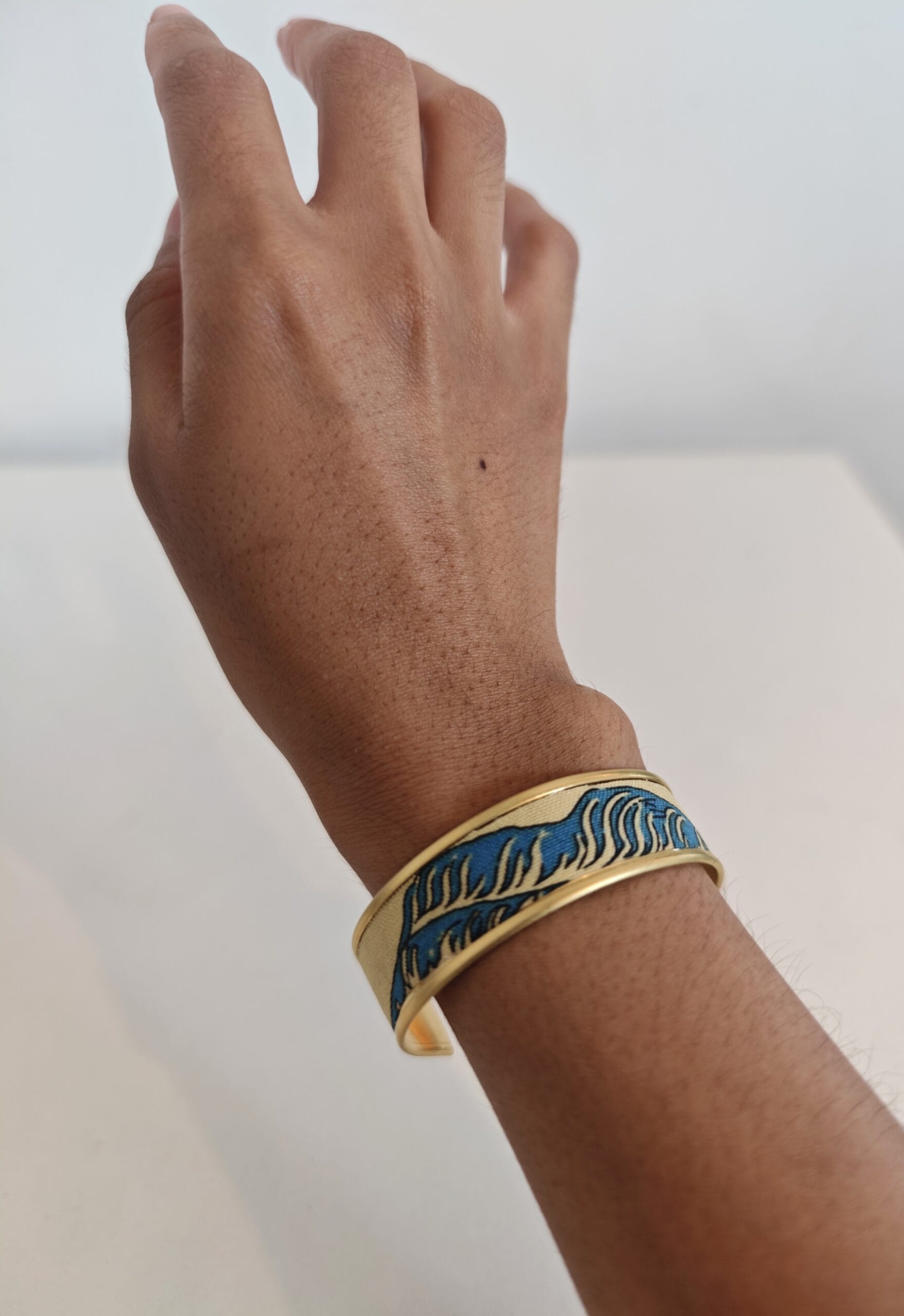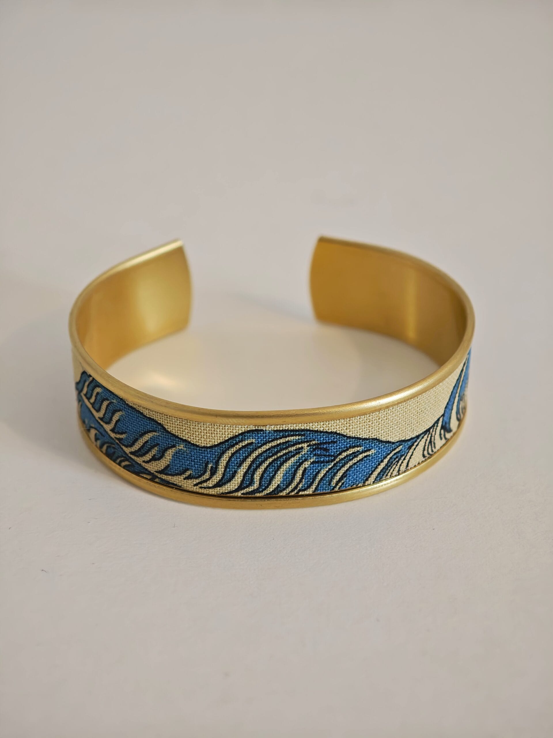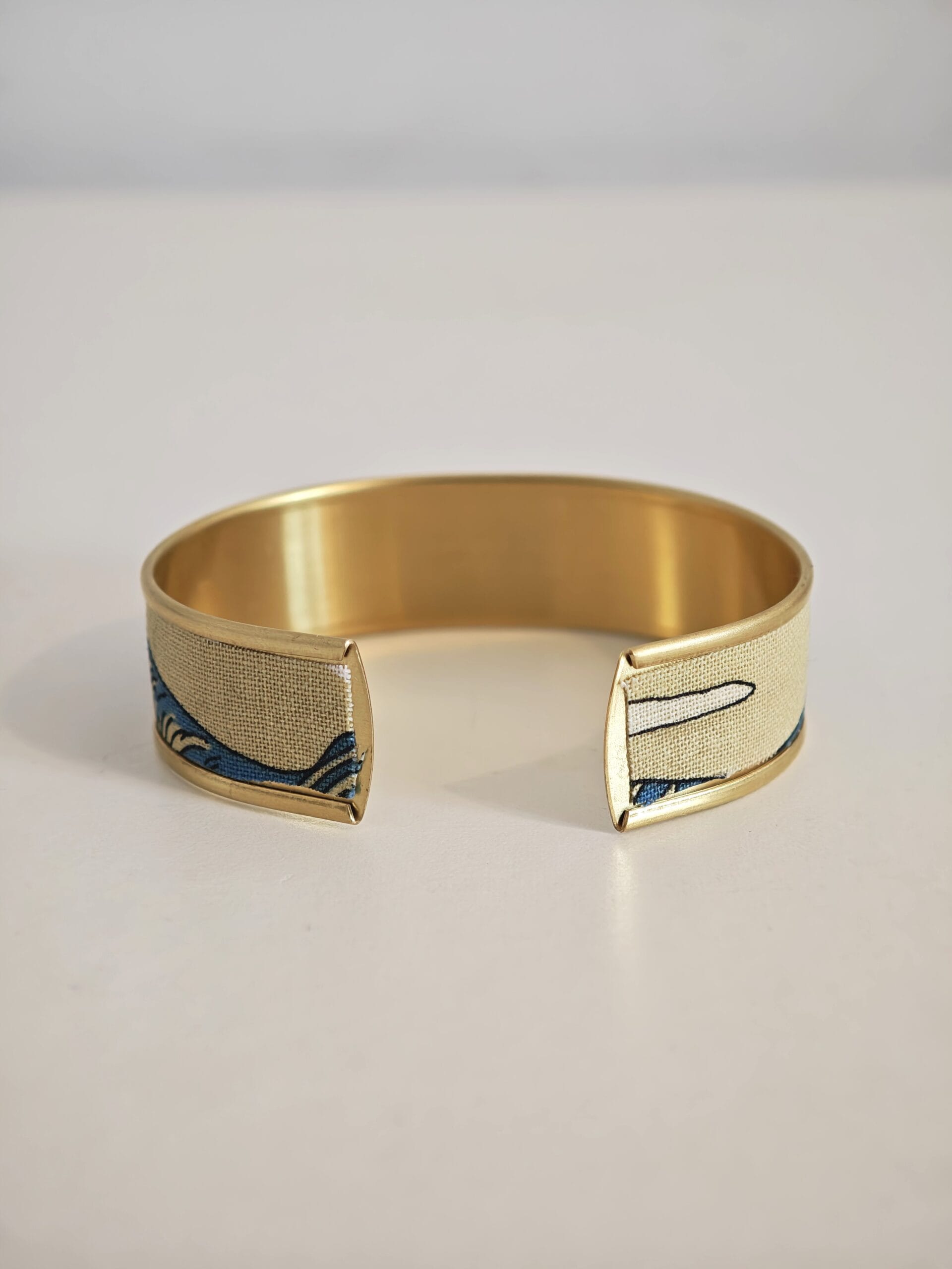 Bracelet manchette réglable en laiton doré avec rebord, recouvert de tissus au motif vague japonaise !