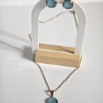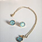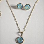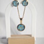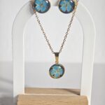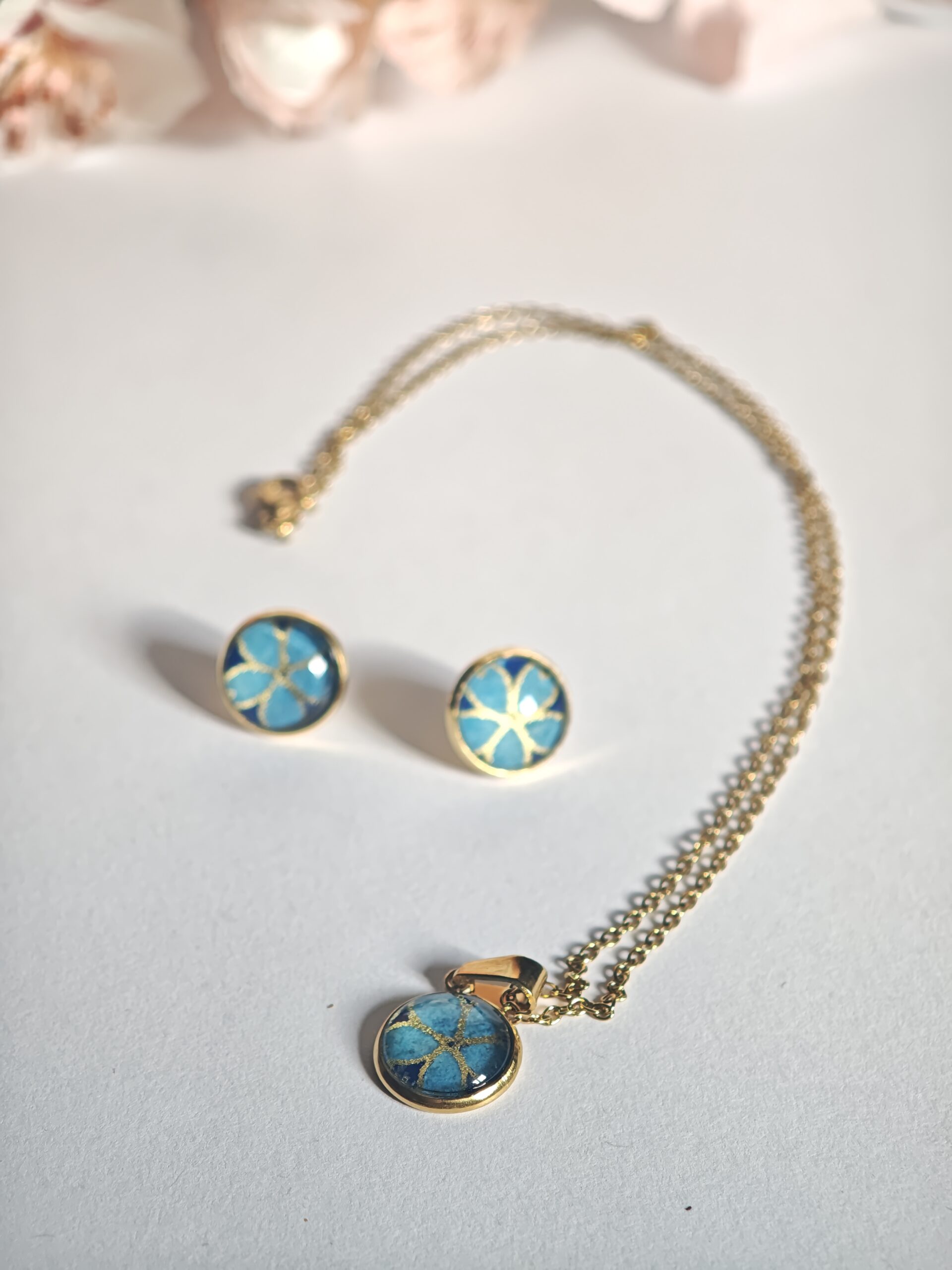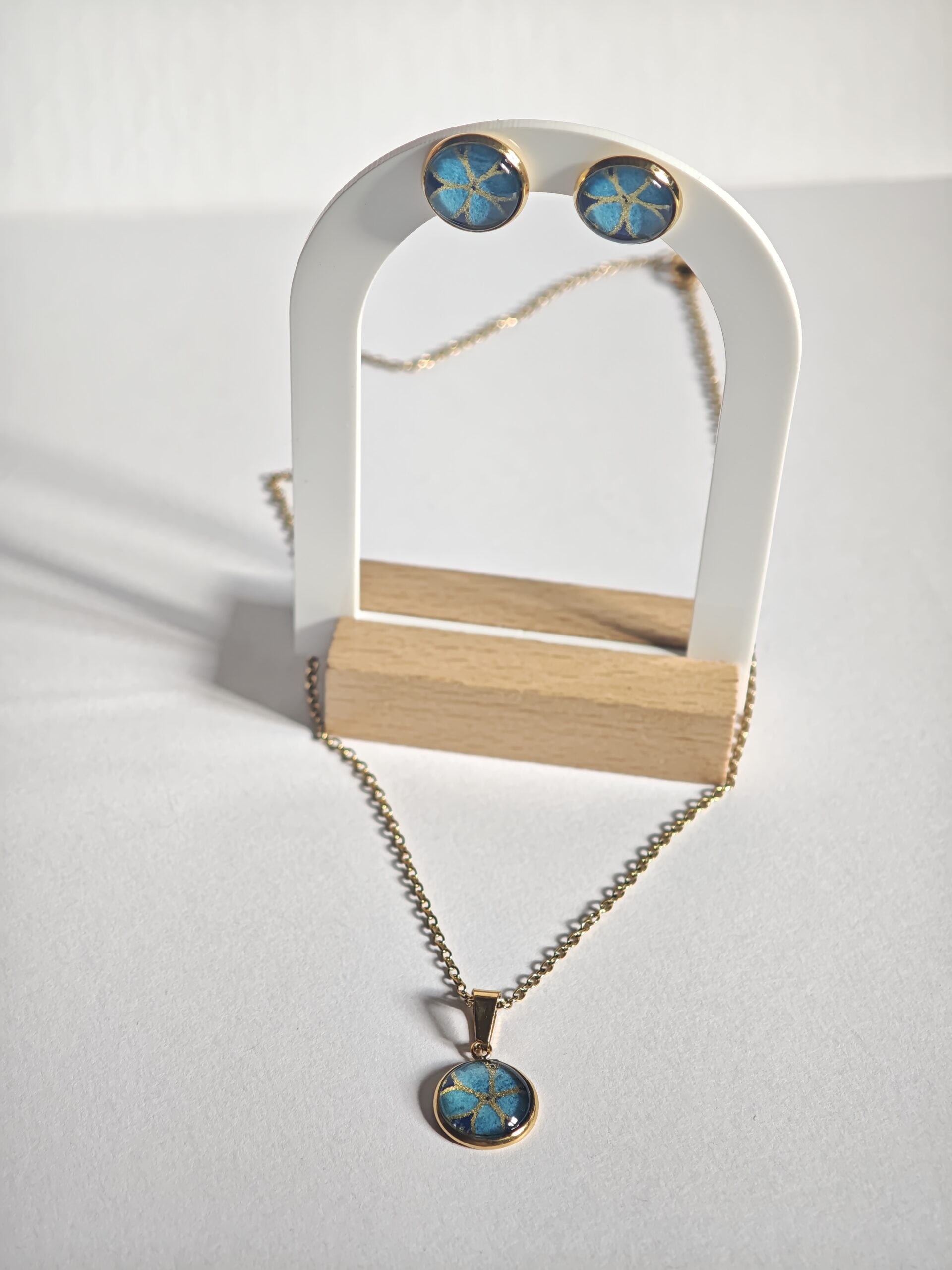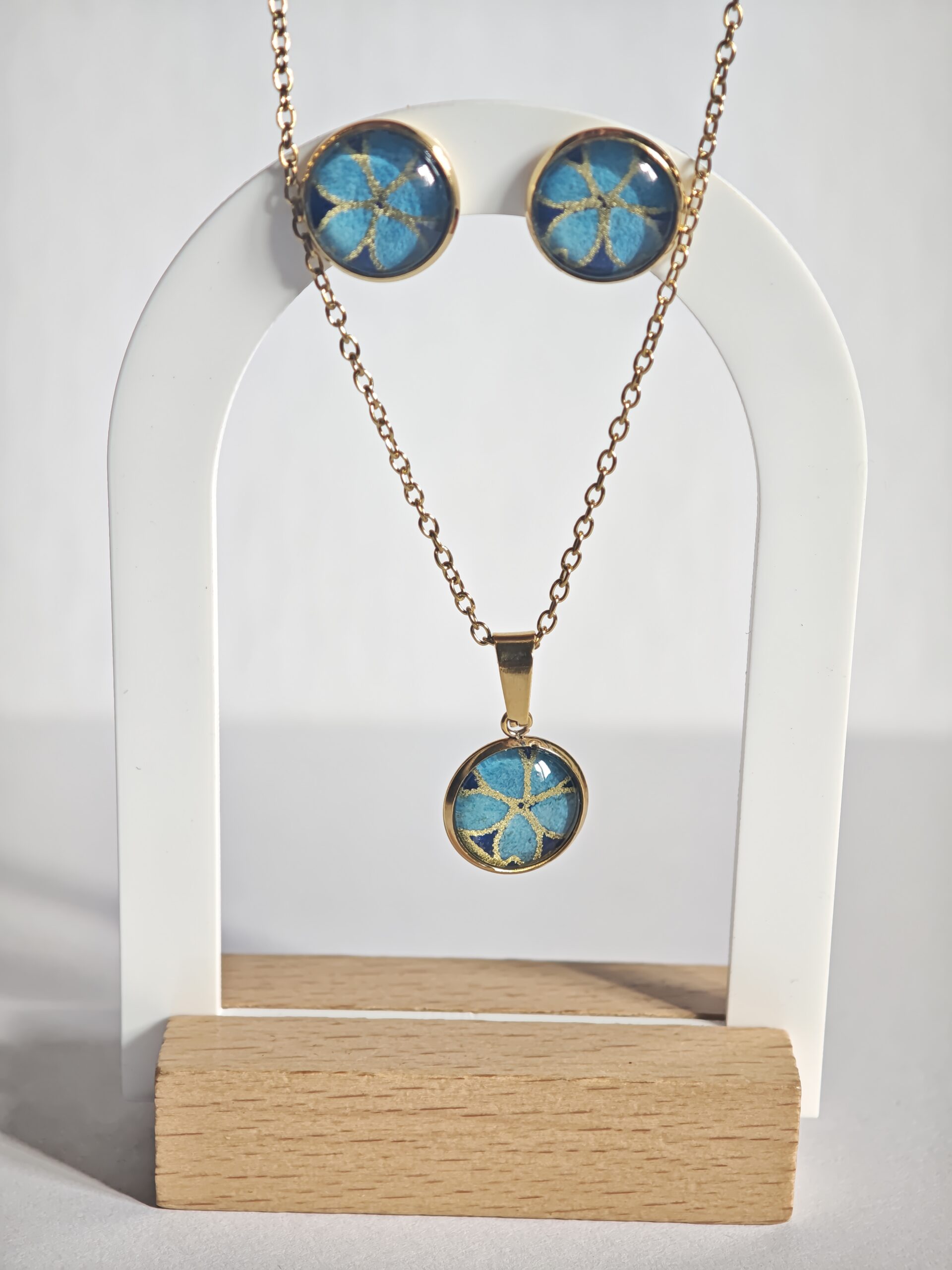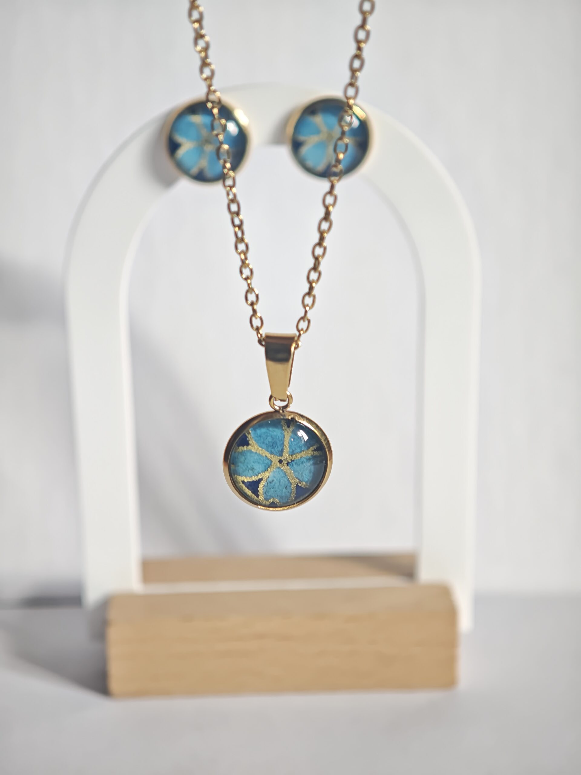 🌸 Parure collier et boucles d’oreilles puces en papier japonais – Motif floral bleu – Bijoux faits main